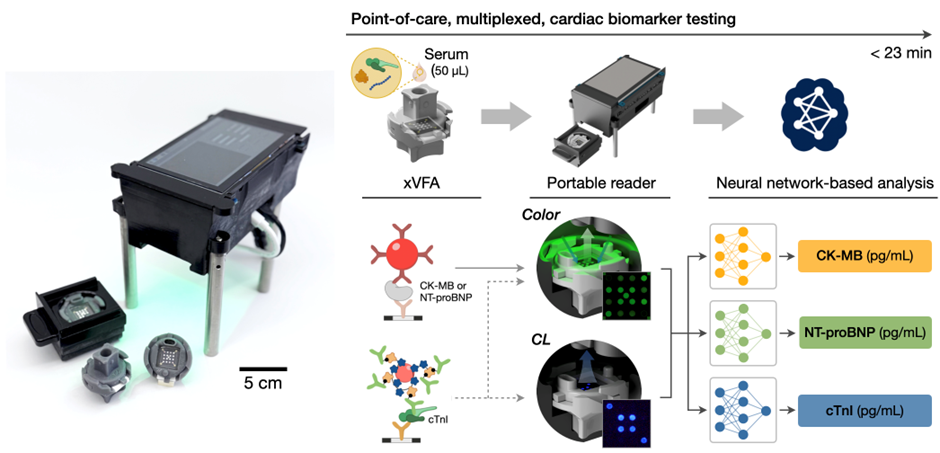A dual-mode vertical flow assay integrates colorimetric and chemiluminescent sensing modalities, a portable reader, and neural network analysis for rapid, multiplexed detection of cardiac biomarkers at the point of care.